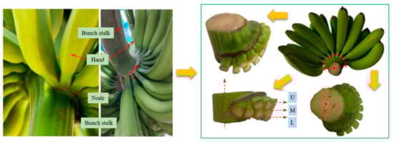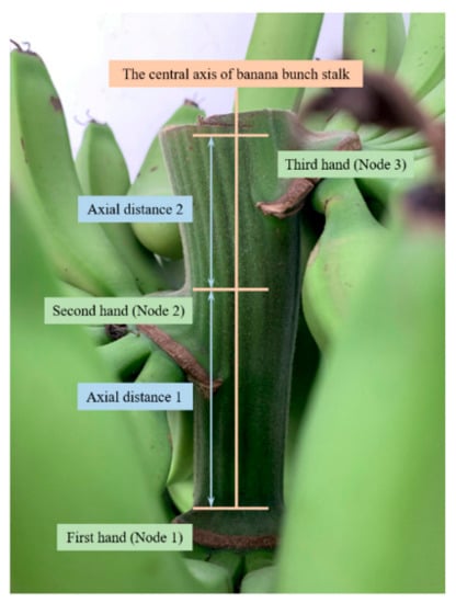 The aboveground part of the banana plant consists of the pseudostem, leaves, bunch, and bud, as shown in Figure 2. The banana bunch is mainly composed of the bunch stalk and banana hands, and the banana hands are circumferentially and axially distributed on the bunch stalk. The bunch stalk is composed of nodes and internodes. The node is also called the crown, which is the part where the banana hand grows. The bunch stalk mainly plays the role of nutrient component transportation, energy storage, and connection between the bunch and plant body. Its length varies with the variety and the planting environment of the banana plant. In order to ensure the taste quality and economic benefits of banana fruit, only 6~9 hands are generally kept in a bunch after the blossom and fruit thinning process [27,28].