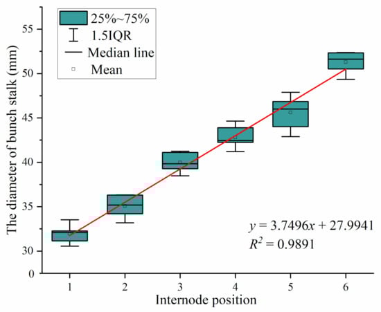 According to the above experimental method, the range of the diameter of bunch stalks we measured was 30.56~52.36 mm. The relationship between the diameter of bunch stalks and the internode positions is shown in Figure 6. From the figure, we can see that the diameter of bunch stalks varies linearly with the internode positions. The regression equation obtained by regression analysis shows that there is a linear correlation between the diameter of the bunch stalk and the internode positions.