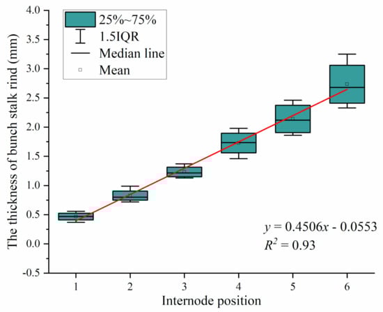 According to the above experimental method, we measured the thickness of bunch stalk rind. The thickness of bunch stalk rind shows an increasing trend with an increase in moisture content. The average value of the thickness of bunch stalk rind picked from banana orchards was 1.68 mm. After three weeks of storage, the average value dropped to 1.37 mm, with standard deviations of 0.88 and 0.68 mm, respectively. The effect of variety on the thickness of rind is not significant (p > 0.05). The average value of the thickness of Brazilian banana bunch stalk rind was 1.58 mm, and the average value of the thickness of plantain banana bunch stalk rind was 1.46 mm. The standard deviations of the two varieties in thickness of rind were 0.81 and 0.78 mm, respectively. The relationship between the thickness of rind and the internode positions is shown in Figure 7. From the figure, we can see that the thickness of rind increases with the increase in internode positions, which shows a linear relationship.
