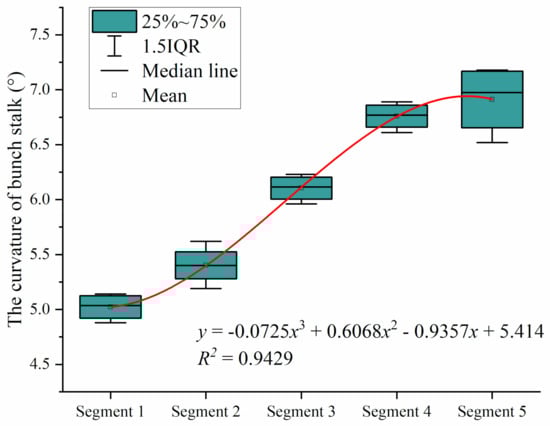 Through the measurement of the curvature of bunch stalk, we found that the average value of the curvature of Brazilian bananas was 6.16°, and the average value of the curvature of plantain bananas was 5.88°. The standard deviations of the curvature of the two varieties were 0.80° and 0.66°, and the corresponding coefficients of variation were 13.00% and 11.16%, respectively. The relationship between the curvature of the bunch stalk and the segment is shown in Figure 8. The curvature of the bunch stalk increases at first and then decreases with the increase of the segment. The fitting results showed that the changing trend is approximately a cubic curve.