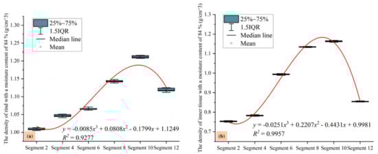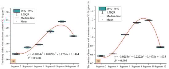 The relationship between the density of bunch stalks with a moisture content of 84% and the segments. (a) The relationship between the density of rind and the segments; (b) the relationship between the density of inner tissue and the segments.