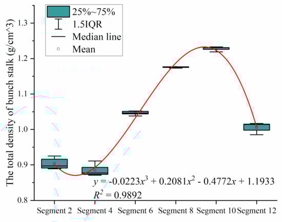 The density of bunch stalks of different moisture contents showed certain differences with the different segments. Figure 9 shows the relationship between the density of rind and the inner tissue of bunch stalks (without nodes) with a moisture content of 93% and the segments. Figure 10 shows the relationship between the density of rind and the inner tissue of bunch stalks (without nodes) with a moisture content of 84% and the segments. Figure 11 shows the relationship between the density of the whole bunch stalk without nodes and the segments. From the figures, we can see that the density of bunch stalks increases at first and then decreases with the increase of segments, and the fitting results show that the changing trend is approximately a cubic curve. According to the relationship model between the experimental factors and the density of bunch stalks, the minimum, maximum and average values of the densities we obtained are 0.871, 1.233, and 1.051 g/cm3, with a standard deviation of 0.128 g/cm3 and a coefficient of variation of 12.29%.