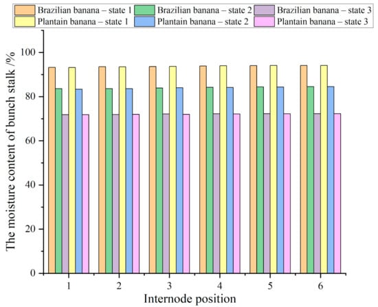 The water in the plant stalk includes free water and combined water. Free water exists in the intercellular space of fiber cells and capillaries; it participates in the biochemical reactions inside the stalk and has the general properties of ordinary water. The property of free water in the stalk is unstable and is easily affected by temperature. Combined water exists in the fiber cells and is combined with starch, protein, and other substances. It is stable in property and not easy to lose and does not participate in the biochemical reactions inside the stalk [33,34,35]. The increase or decrease of moisture in the stalk mainly refers to the change of free water. The moisture content of the banana bunch stalk refers to the percentage of the total mass of free water and combined water to the mass of bunch stalk. Brazilian banana and plantain banana were chosen as the experimental varieties. We set 6 internode positions on the bunch stalk. In addition, we set three states according to storage time. State 1 is just after being picked from the banana orchards. State 2 is after being placed outdoors for 3 weeks. The average temperature in the 3 weeks was 24 °C, the relative humidity was 82% RH (Relative Humidity), and the atmospheric pressure was 1006 hPa. State 3 is after being placed outdoors for 4 weeks. The average temperature in four weeks was 25 °C, the relative humidity was 90% RH, and the atmospheric pressure was 1011 hPa.