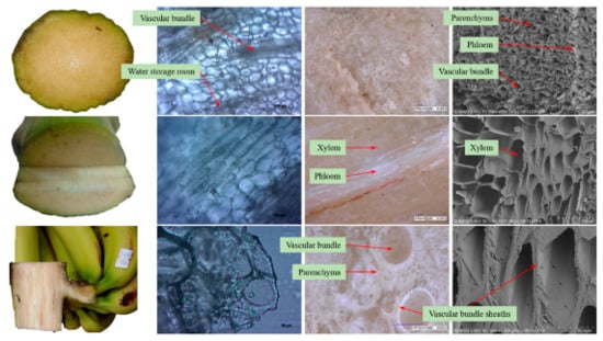 - Zhao, L.; Yang, H.; Xie, H.; Duan, J.; Jin, M.; Fu, H.; Guo, J.; Xu, Z.; Jiang, T.; Yang, Z. Effects of morphological and anatomical characteristics of banana crown vascular bundles on cutting mechanical properties using multiple imaging methods. Agronomy 2020, 10, 1199. [Google Scholar] [CrossRef]