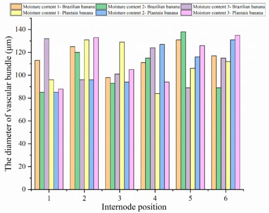 Although the above method has the advantages of high recognition accuracy and scientific data analysis, they have higher requirements for hardware, need a long time for image recognition and analysis, and require enough sample pictures to ensure the accuracy of the final test. Therefore, we used the method of combining a zoom microscope and image processing software to measure the diameter of the vascular bundles. Brazilian banana and plantain banana were selected as the experimental varieties, and bunch stalks with moisture contents of 93%, 91%, and 84% were divided into six internode positions, respectively. We cut the bunch stalk from the middle of internode positions, set the cross-section as the datum plane and the long axis of the datum plane as the datum line, and then set sampling points at 1/4, 1/2, and 3/4 of the long axis. We cut samples of 5, 5, and 2 mm in length, width, and height along the axial and radial directions at the sampling points and gripped them to glass slides with tweezers to prepare longitudinal and transverse slice samples. After the samples were prepared, we used the Keyence VHX-900F super-depth three-dimensional microscopy system to observe the microscopic morphology of the bunch stalk and measure the diameter of the vascular bundles in the slice tissue at the same time. The steps were repeated three times for samples of the same variety, moisture content, and internode position. The diameter of vascular bundles (dvb) can be obtained as follows in Equation (7):