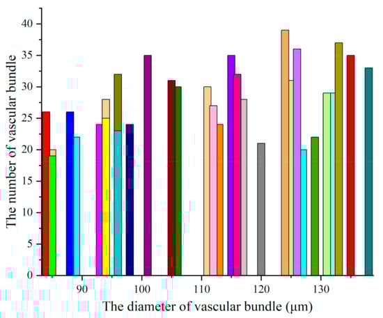 The bunch stalk is rich in high-quality plant fibers, with high strength and good air permeability, so it is often used as textile raw material and to prepare reinforced composite materials [36]. The main components of the bunch stalk are pectin, lignin, and hemicellulose. The mass fraction of hemicellulose is 19.70%, the mass fraction of lignin is 22.60%, and the mass fraction of pectin is 2.83% [37,38]. The internal tissue of the bunch stalk is mainly composed of phloem, parenchyma, xylem, the vascular bundle, and the vascular bundle sheath. Among them, the vascular bundle is mainly responsible for transporting water and nutrients and supporting the banana plant. The geometric parameters of the vascular bundles in the bunch stalk are different, and the carrying capacity of the bunch stalk will be different.