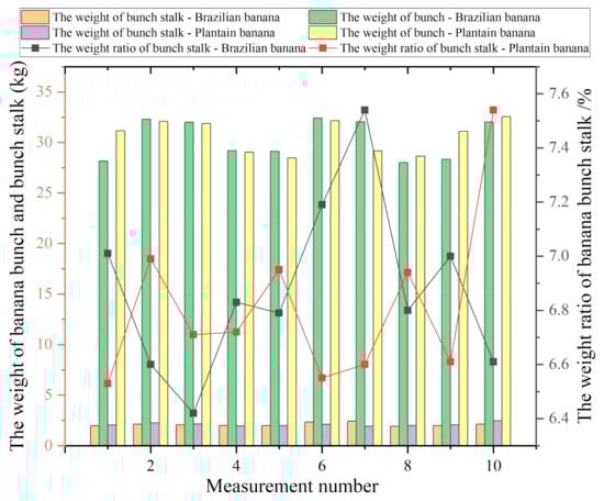 The weight of bunch stalk, the weight of bunch, and the weight ratio of the bunch stalk of Brazilian banana and plantain banana are shown in Figure 16.