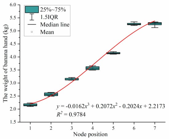 According to the experimental results, the minimum, maximum and average values of the weight of bunch stalks we obtained were 1.906, 2.455, and 2.088 kg, respectively, with a standard deviation of 0.155 kg and a coefficient of variation of 7.443%. The minimum, maximum, and average values of the weight of bunches were 28.023, 32.562, and 30.492 kg, respectively; the standard deviation is 1.696 kg, and the coefficient of variation is 5.563%. The minimum, maximum, and average values of the weight ratio of bunch stalks were 6.422%, 7.544%, and 6.848%, respectively. The minimum, maximum, and average values of the weight of Brazilian banana bunch stalks were 1.906, 2.418, and 2.089 kg, respectively, with a standard deviation of 0.158 kg and a coefficient of variation of 7.563%. The minimum, maximum, and average values of the weight of Brazilian banana bunches were 28.023, 32.411, and 30.362 kg, respectively, with a standard deviation of 1.835 kg and a coefficient of variation of 6.044%. The minimum, maximum, and average values of the weight ratio of Brazilian banana bunch stalks were 6.422%, 7.544%, and 6.881%, respectively. The minimum, maximum, and average values of the weight of plantain banana bunch stalks were 1.923, 2.455, and 2.087 kg, respectively, with a standard deviation of 0.153 kg and a coefficient of variation of 7.321%. The minimum, maximum, and average values of the weight of plantain banana bunches were 28.453, 32.562, and 30.623 kg, respectively; the standard deviation was 1.534 kg, and the coefficient of variation was 5.009%. The minimum, maximum, and average values of the weight ratio of plantain banana bunch stalks were 6.528%, 7.539%, and 6.814%, respectively. By comparing the experimental results, we found that the reason for the difference in the weight of bunch stalks, bunches, and hands may be due to the difference in variety and node positions. The relationship between the weight of banana hands and the node positions is shown in Figure 17. From the figure, we can see that the weight of banana hands increases with the increase in the node positions, and the fitting results showed that the changing trend is approximately a cubic curve.