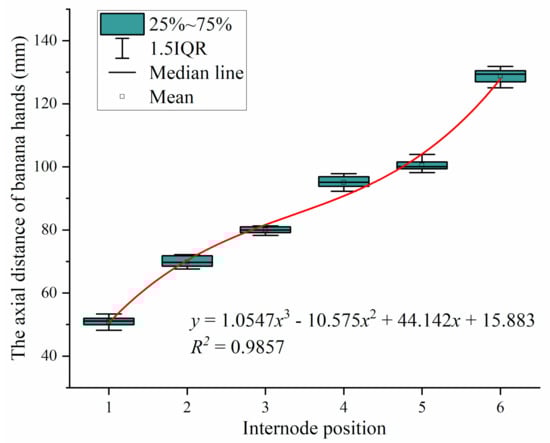 According to the above experimental method, the average range of the axial distance of banana hands we obtained is 50.48~129.99 mm. The relationship between the axial distance of banana hands and the internode positions is shown in Figure 18. From the figure, we can see that the axial distance of banana hands increases with the increase of internode positions. The fitting result shows that the changing trend is approximately expressed as a cubic curve.