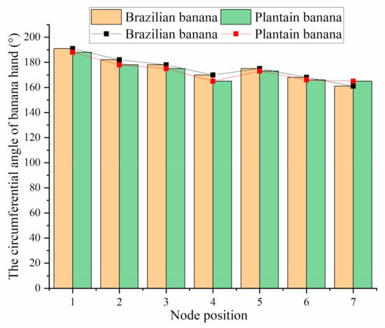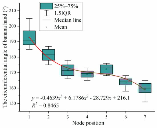 The average range of the circumferential angle of banana hands we obtained was 161~191° through the experimental measurements. The statistical values of the circumferential angle of banana hands are shown in Figure 19, and the relationship between the circumferential angle of the banana hand and the node position is shown in Figure 20. From the figures, we can see that the circumferential angle of banana hands decreases with the increase of node position, and the fitting results show that the changing trend is approximately a cubic curve.