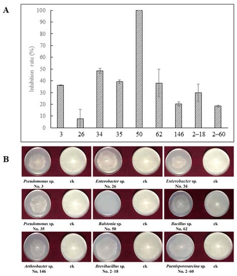 The tested strains were Pseudomonas sp. (No. 3), Enterobacter sp. (No. 26), Enterobacter sp. (No. 34), Pseudomonas sp. (No. 35), Ralstonia sp. (No. 50), Bacillus sp. (No. 62), Arthrobacter sp. (No. 146), Brevibacillus sp. (No. 2–18), and Paenisporosarcina sp. (No. 2–60), respectively. They all inhibited the growth of R. solani by releasing VOCs, with the inhibition ranging from 7.84% to 100%. The strain No. 50 of Ralstonia sp. had the strongest inhibitory effect (100%). The weakest inhibitory effect (7.84%) was recorded for the strain No. 26 of Enterobacter sp. The inhibitory effects of the strains No. 3, No. 34, No. 35, No. 62, No. 146, No. 2–18, and No. 2–60 were 36.08%, 48.63%, 39.22%, 38.04%, 20.39%, 29.80%, and 18.43%, respectively (Figure 1).
