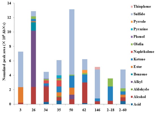 The VOCs released by all tested strains were mainly esters, olefins, alkanes, ketones, acids, thiophenes, aldehydes, naphthalenes, sulfides, phenols, alcohols, pyrazines, pyrroles, and benzenes. All strains released alcohols, but strains No. 34 and 62 released the most amounts. Strains No. 3, 35, 50, 146, and 2–60 released the largest amounts of sulfides, strain No. 26 released the largest amounts of alkanes, while strain No. 2–18 released the largest amounts of ketones (Figure 3).