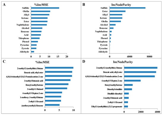 The relative importance of different VOCs was estimated by constructing a random forest model. It was found that sulfides, olefins, alkyls, ketones, and esters were more important than the other types of VOCs. The ranking was based on two criteria: Mean Square Error and Node Purity. The proportion of variance explained by this model was 94.23% (Figure 4A,B). In addition, a random forest model of the importance of different individual VOCs was established. This model explained 95.24% of the variance. Using this model, the top 10 most important VOCs were ranked. These compounds with decreasing importance were 2-methyl-2-methylthio-butane, benzoic acid ethyl ester, 6,10,14-trimethyl-5,9,13-pentadecatrien-2-one, 3-methyl-butanoic acid, and benzyl methyl ketone (Figure 4C,D).