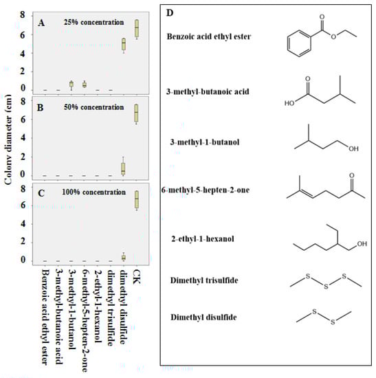 The PDA medium dish edge fragment was placed in a sterilized 200 μL container. R. solani fermentation broth (10 μL) was added to the center of the medium. Pure chemical compounds (50, 100, and 200 μL) benzoic acid ethyl ester (Sangon Biotech, Shanghai, China), 3-methyl-butanoic acid (Adamas, Basel, Switzerland), 3-methyl-1-butanol (Sigma-Aldrich, St. Louis, MO, USA ), 6-methyl-5-hepten-2-one (Sigma-Aldrich, St. Louis, MO, USA), 2-ethyl-1-hexanol (Sigma-Aldrich, St. Louis, MO, USA ), dimethyl disulfide (Macklin, Shanghai, China), and dimethyl trisulfide (Macklin, Shanghai, China) were added to the container separately, with sterile water added if the volume was less than 200 μL (the concentrations were 25%, 50%, and 100%, 25%: 50 μL pure compound and 150 μL sterile water/plate, 50%: 100 μL pure compound and 100 μL sterile water/plate, 100%: 200 μL of pure compound/plate). Their concentrations were greater than 98%. The same amount of sterile water (200 μL) was added to the control container, and was cultivated in the dark at 32 °C to observe growth. All treatments had four replicates.