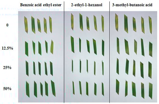 Benzoic acid ethyl ester had the strongest suppression on R. Solani infection, with nearly complete inhibition under all tested concentrations greater than 12.5%. 2-Ethyl-1-hexanol inhibited the infection of detached leaves by R. solani at the concentration of 12.5%. The effect of benzoic acid ethyl ester became increasingly obvious as the concentration of benzoic acid ethyl ester increased. By contrast, 3-methyl-butanoic acid showed only a slightly inhibitory effect on R. solani at all tested concentrations, but inhibition did not reach very high levels. (Figure 6).