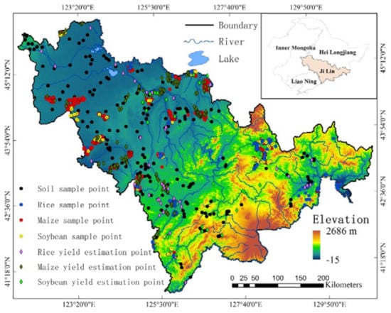 Jilin Province is located between 121°38′–131°19′ E and 40°52′–46°18′ N (Figure 1). Its total area is 187,400 , accounting for 2% of the total land area of China. There are obvious differences in landforms, with the western foothills of Dahei Mountain as the boundary in the central part; the Changbai Mountain, with a high altitude and low hills below 500 m above sea level in the east; and the vast hinterland of Songliao Plain in the west. There are over 2000 rivers in Jilin Province, and they belong to five major river systems, namely, Songhua River, Liaohe River, Tumen River, Yalu River, and Suifen River. The average density of the river network is 0.19 , and the river network density is higher in the eastern mountainous area and lower in the western plains region. The average amounts of water per hectare of cultivated land in the province are lower than the national average. The soil types are complex and diverse, and the distributions have obvious meridional differentiation in Jilin Province. The natural fertility of the soil is high and is dominated by loam, sand, silty clay, silt loam, and clay. From west to east, the soil is regularly distributed in the eastern mountains and shows obvious vertical zonality. There are obvious seasonal changes and regional differences in temperature, precipitation, and temperature in Jilin Province. The average temperature is below −11 °C in winter and is above 23 °C in summer. The average perennial sunshine length ranges between 2259 and 3016 h. The average annual precipitation is 400–600 mm, 80% of which is concentrated in summer, with the most abundant rainfall in the east of the province. Jilin Province is rich in natural resources and fertile soil and is especially conducive to the growth of maize, rice, and soybeans. Among them, under the influence of water resources, rice is mainly planted in five river basins, soybeans are mainly grown in the central and eastern parts of Jilin Province, and maize is planted throughout the whole province.