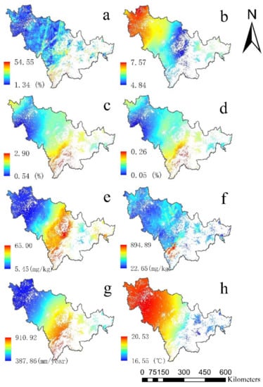Interpolation map for the parameters influencing land suitability evaluation. (a) Slope; (b) pH; (c) OC; (d) TN; (e) AP; (f) AK; (g) mean annual rainfall; (h) mean annual temperature.