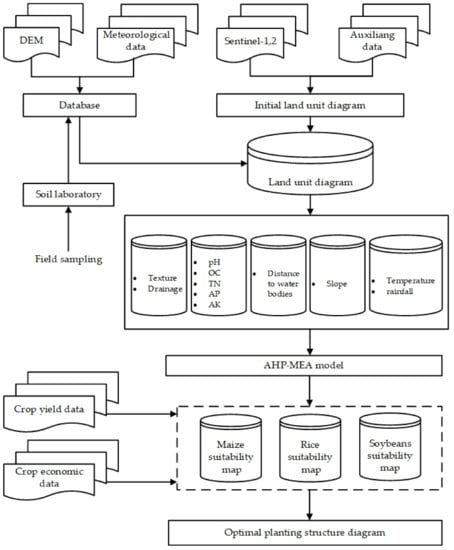 Land suitability assessment is a method of land evaluation. In this paper, AHP, MEA, and RS technology are used to measure the suitability degree of land for maize, rice, and soybeans. The specific process is shown in Figure 3 and described as follows: