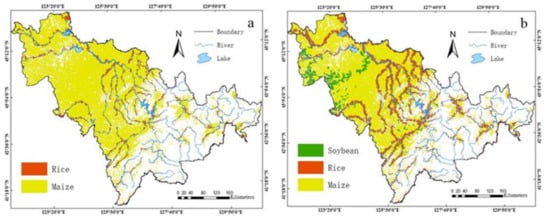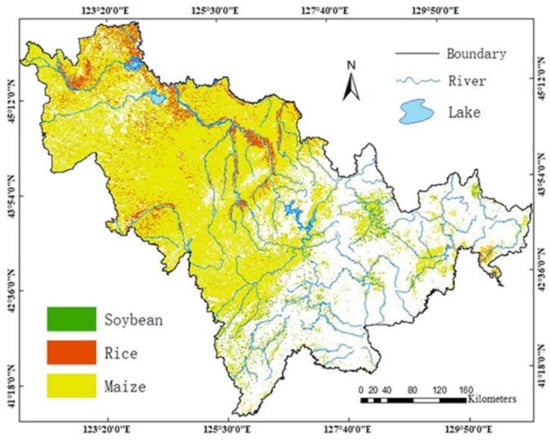 Step 2: The cultivated land area was extracted from the classification results of the first step, and the classification method of maize, rice, and soybeans was the same as that of the first step.