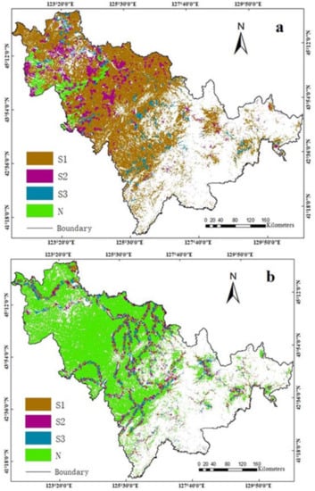 The planting structure optimization map of Jilin province: (a) Planting Structure 1; (b) Planting Structure 2.
