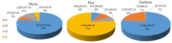 The land suitability evaluation of maize, rice, and soybeans has been realized in Jilin Province via MEA (Figure 5), namely, in terms of high suitability (S1), moderate suitability (S2), marginal suitability (S3), and unsuitability (N). MEA is based on extension mathematics and fuzzy mathematics and quantifies qualitative and quantitative factors through membership degrees to ensure the integrity of information. MEA effectively avoids the influence of subjectivity in the membership function calculation [59]. From the perspective of space, the highly, moderately, and marginally suitable areas of rice are mainly distributed near rivers. In these areas, water sources are sufficient, which is beneficial to rice cultivation. Highly suitable areas of maize and soybean cultivation are mainly distributed in the central plains and the eastern mountainous area of Jilin Province. Moderately suitable areas of maize cultivation are scattered throughout Jilin Province, while moderately suitable areas of soybean cultivation are mainly distributed in the western part of Jilin Province. As for the areas with marginal suitability and unsuitability, maize areas are mainly distributed in the western region of Jilin Province, while soybean areas are distributed in the central and eastern regions. In order to evaluate the accuracy of the model, the LSI data were analyzed with the measured yields of the three crops via linear regression analysis (Figure 6). The results show that the result of the AHP–MEA has high precision. For the evaluation of the data, it was determined that for the yield of maize,, for the yield of soybean,, and for the yield of rice, . The areas of the three crops, with different suitability grades, varied greatly, as shown in Figure 7.