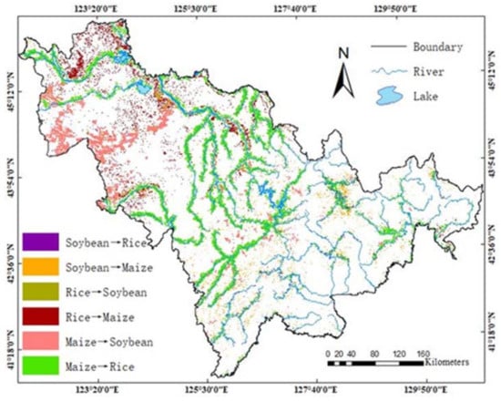 Through the analysis of different spatial planting structures (Table 8 and Figure 9), it was found that with Spatial Planting Structure 1, which only considered crop yield and price, the output would rise by 3.27 billion yuan compared with the existing planting structure. There are no suitable planting areas for soybeans, and the main reason for this is that the soybean yields are far lower than maize and rice, the production costs are high, and the entailing field management is complex. China has introduced a grain subsidy policy to boost farmer incomes and encourage the growth of soybeans. This is a policy that, along with farmer profit maximization, has led to more farmers choosing to grow soybeans. Therefore, Spatial Planting Structure 2, which takes producer subsidies and costs into account, can reflect the wishes of farmers and the increase in the agricultural output value of the region better, reaching 12.44 billion yuan more than the total output value for Spatial Planting Structure 1. Through the comparative analysis of Planting Structure 1 and Planting Structure 2, it can be found that Jilin Province, a province in the “golden maize belt”, is suitable for maize cultivation in most areas, and the yields of maize would be high. Rice is mainly distributed in the vicinity of rivers and lakes, but the area for Planting Structure 2 is 1.35 million ha larger than that of Planting Structure 1, and the increased area is mainly distributed in the vicinity of rivers and lakes. In this way, water resources can be fully utilized [63]. With Planting Structure 2, soybeans are mainly distributed in the western part of Jilin Province, which is adjacent to Inner Mongolia. The region features strong wind and sand deposition in spring, resulting in serious soil desertification and poor fertility. There are also a few areas suitable for soybean planting in the eastern mountainous area of Jilin Province. Ground slope is the main factor limiting the planting of maize in these areas. A study has shown that areas with a larger slope are more suitable for soybean cultivation [16]. In these regions, maize yields are far lower than in other regions, and the output value is lower than that of soybeans after food subsidies. Therefore, soybean cultivation is more suitable in these regions, which is conducive to the increase of the total output value of grain in Jilin Province. At the same time, planting different crops can realize the rational utilization of land resources and water resources, which is conducive to the sustainable development of agriculture.