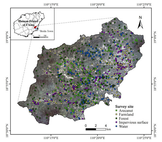 Hainan Province contains the largest arecanut production area in China, with the greatest planting area located in Wanning City. In 2018, the planting area reached 18,138 hm2, accounting for 16.5% of the total planting area in Hainan [2]. Beida Town is the principal planting area of arecanut in Wanning City. The town also grows cash crops such as rubber, pineapple, and lychee.