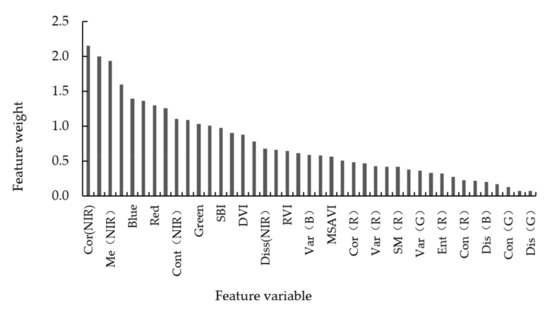 The initial feature space contains a total of 41 feature variables (9 spectral and 32 textural feature variables). A large number of feature variables will generate redundant data, increasing the model complexity and affecting the classification accuracy. We employed the RF algorithm to evaluate the importance of the 41 feature variables in the initial feature space, ranking their importance based on the feature variable weights. Figure 2 presents the importance rankings of the target feature variables, whereby the first 12 feature weights are greater than 1, the middle 12 feature weights range between 0.5 and 1, and the latter 17 feature weights are less than 0.5. Then, according to the order of feature importance, the first k (i = 1, 2, ……, 41) feature variables were selected to construct the random forest classification model of arecanut, and the overall classification accuracy was subsequently calculated. The overall classification accuracy is maximized to 88.3% when the number of feature variables equals 14. Therefore, the first 14 feature variables (CorNIR, VarNIR, MeNIR, MeR, RB, EntNIR, RR, RNIR, ConNIR, MeB, RG, NDVI, SBI, and HomNIR) were selected to construct the optimized feature space.