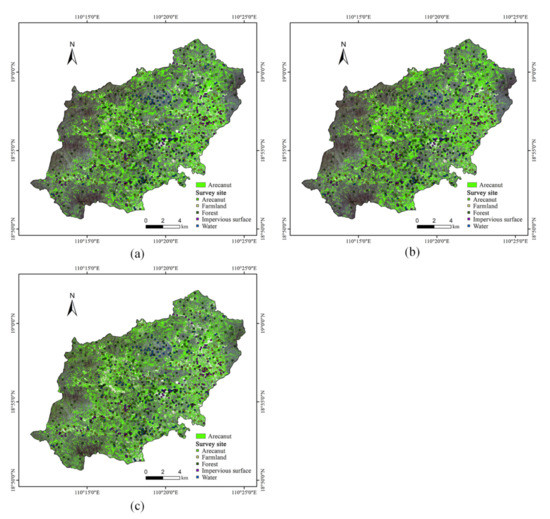 The principal land use/cover types in the study area are farmland, forest, impervious surface (urban and rural areas; industrial and mining, water conservancy construction, and transportation land), water (rivers, lakes, ponds, etc.), and arecanut grove. Table 2 lists the visual interpretation characteristics of the main features in the study area. Ground sample data were obtained through field surveys with a GPS receiver on 19–21 March 2019. The coverage size of the field should be more than 10 m × 10 m. According to the location of the survey sites, the field boundaries were then drawn based on Google Earth Pro (version 7.3.2.5776). Finally, a total of 850 field polygon samples were determined. There are 150 samples for water, 150 for impervious surface, 200 for forest, 150 for farmland, and 200 for arecanut grove, with 70% and 30% of the samples used for training and verification, respectively.