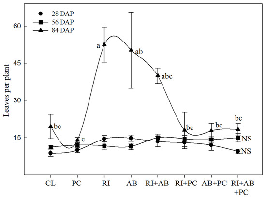 Similar behavior was observed for the number of leaves (Figure 1), where the plants inoculated with RI, AB, and RI + AB, were outstanding compared to those inoculated with PC.