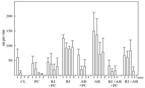 The foregoing is relevant, as successful cultivation of S. edule is identified by the formation of a canopy of vines that protects the youngest and most productive vines, since it is grown in a horizontal structure. S. edule produces one to two fruits per node longitudinally; therefore, the longer the vines are, the greater the number of fruits will be [8]. In terms of plant survival in the field, RI + PC treatment, as well as AB + PC, is relevant for its possible protective effect.
