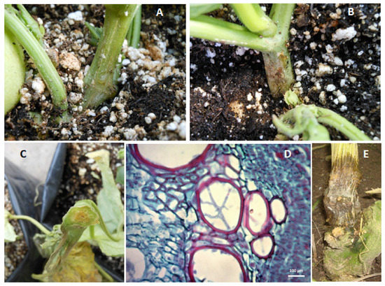 Sequence of damage in the basal vine (vital node) of S. edule var. virens levis Costa Rica Type. (A–C) 22 days after inoculation with P. capsici. (D)Transversal histological section of the stem, with coenocytic mycelial hyphae of P. capsici in the vascular bundle 30 days after inoculation. (E) Total necrosis of the adult plant basal guide taken in the field.