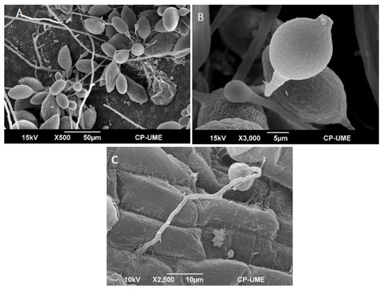 Phytophthora capsici on seed root tissue of S. edule var. virens levis Costa Rica Type. (A,B) sporangia and zoospores. (C) in germinated seed root tissue. Scanning electron microscope micrographs. 500×, 3000×, 2500×, respectively.