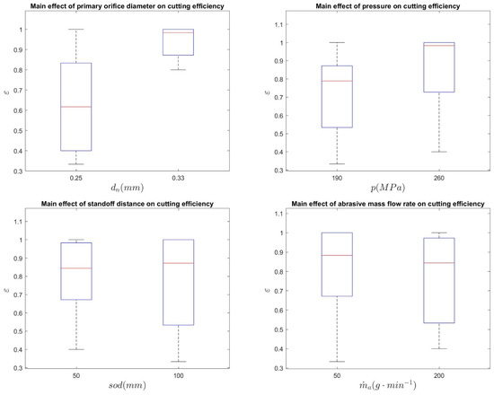- Primary orifice diameter and water pressure, in Table 7, are both significant factors: moving from low level to high level the cutting efficiency increases. This result agrees with [27,28];