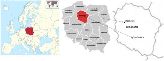 The research was carried out in two three-year-long (2009 to 2011) one-factor experiments, which was carried out in a randomized block design in four repetitions. One experiment was conducted on the farm located in Szadłowice (52°50′ N, 18°20′ E—WGS84), on a typical Phaeozem that, according to WRB, had been formed of a sandy loam (clay 6–12%, sand 55–72%, silt 18–35%). The second experiment was carried out at the experimental station in Mochełek (17°51′ E, 53°13′ N—WGS84) near Bydgoszcz (Figure 1) on typical Luvisol that had been formed of a sandy loam (clay 6%, sand 79%, silt 15%) [].