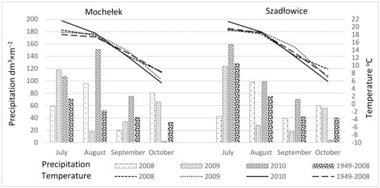 Air temperatures during this period were less volatile over the years (Figure 2). Relatively high average monthly temperatures were found in July and August. Both in Mochełek and in Szadłowice, the temperatures in the June and August were higher than the long-term average for this region. In September, temperatures were lower in 2008 and 2010, and in 2009, higher than the long-term averages. In 2008, relatively high temperatures in October had a positive impact on the growth and yield of the catch crop.
