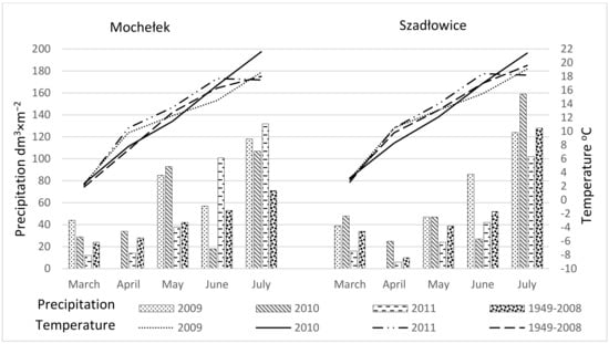 Weather conditions during the spring barley vegetation period were diversified in the years of the research (Figure 3). The amount of precipitation in both localities were relatively high throughout the whole study period. The distribution of rainfall was less favourable, which in none of the three years of the study was consistent with the demand for barley. In 2009, in Mochełek, a fairly good water supply of barley was found, in the period from the beginning of shooting to maturation. In 2010, there was a shortage of rainfall during the grain formation period (June), and in 2011, the rainfall deficit was noted during the tillering and shooting (April to May). In 2009, in Szadłowice, there was a shortage of rainfall during tillering and shooting, as well as good water supply in the period of grain formation and maturation. In 2010 and 2011, the major part of rainfall occurred only in the period of plant maturation.