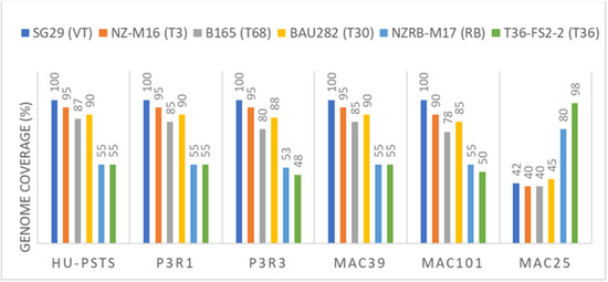 The single reads retained after the host filtering were aligned with reference genomes of six CTV isolates representative of the main six genotypes [17] (Table 3). All the libraries showed a high number of read counts with SG29 (VT) corresponding to 71% of the entire library of P3R1, 58% of P3R3 and 84% in HU-PSTS, and 100% of genome coverage in all these libraries. Alignments with NZM16 (T3), B165 (T68), and Bau282 (T30) gave fewer reads ranging from 66% to 44%, with a coverage of about 95%, 85% and 90%, respectively (Figure 2), whereas alignments with the RB and T36 strains gave less than 35% read counts and a low percentage of coverage (50–45%) (Figure 2). The quality of alignments of the P3R1 library for each reference genome is shown as “genome histograms” and “genome fraction coverage” in Figure 3. Assuming that a 95% of genome coverage can be indicative of the presence of additional CTV strains in mixed infections and a maximum of 92% can be obtained for non-target genomes [32,57], the samples P3R1, P3R3 and HU-PSTS were further characterized by RT-PCR and real-time PCR [49,50,51] for CTV strain identification. P3R1 and P3R3 were positive only for VT, whereas HU-PSTS reacted positively to VT, T3 and T30 probes, and negatively to T36 and T36NS. On the other hand, although the RT-PCR detection for T3 and T68 strains were negative, the high homology of nucleotide sequences between VT and T3 cannot completely exclude the potential presence of T3 in the HU-PSTS.