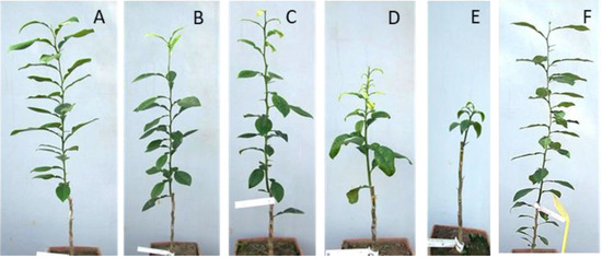 Figure 4. Symptomatic responses of sour orange seedlings inoculated with Mac39 (A), Mac101 (B), Mac25 (C), P3R1 (D), P3R3 (E), 6 months post-inoculation in comparison to non-inoculated control (F).