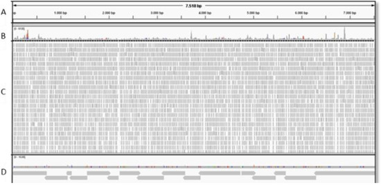 Figure 6. Visualization of the consensus alignments of citrus yellow vein clearing HU generated by both “map to reference” alignment of siRNA reads and de novo assembled contigs. (A) CYVCV CQ reference genome; (B) coverage obtained by siRNA reads alignment; (C) siRNA library (171,807 reads) which allowed the CYVCV-HU full genome reconstruction; (D) consensus obtained by alignments of 16 contigs. For the visualization the Integrative genome viewer (IGV) software has been used [47].