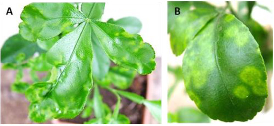 Figure 8. Symptoms of citrus tatter leaf on young (A) and mature (B) leaves of Carrizo citrange induced by bark inoculation of sour orange HU-PSTS infected, about 4–5 months post-inoculation.