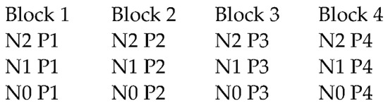 The soil was slightly acid to neutral (pH < 7) with low organic matter content (<2%). Adequate fertilization for P (115 kg ha−1 in 2014 and 145 kg ha−1 in 2015) and K (150 kg ha−1 in 2014 and 195 kg ha−1 in 2015) was applied as basal. In the spring, nitrogen fertilization was applied as follows: N0—no fertilization in spring, N1—pre-sowing (45 kg ha−1 N) and N2—pre-sowing (45 kg ha−1 N) with topdressing at 2–4 leaf stage (54 kg ha−1 in 2014 and 40.5 kg ha−1 in 2015). Based on N min analysis in spring (Table 1), the topdressing was different in each year of the study.