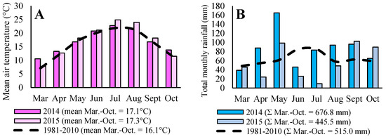 (A) Mean air temperature (°C) and (B) monthly rainfall (mm) during sugar beet vegetation (March to October) in 2014 and 2015 in comparison to the long-term mean (1981–2010) of climatological station Gradište [38].