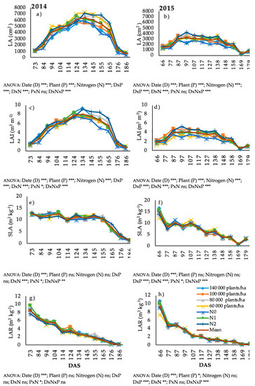 Changes of LA (a,b), LAI (c,d), SLA (e,f), and LAR (g,h) per plant during sugar beet vegetative growth as related to different plant densities (P) and nitrogen fertilization rate (N) in 2014 (on the left) and 2015 (on the right). The ANOVA results refer to LA, LAI, SLA, and LAR; the levels of significance were indicated with p < 0.05 (*), p < 0.01 (**), p < 0.001 (***) or ns for not significant.