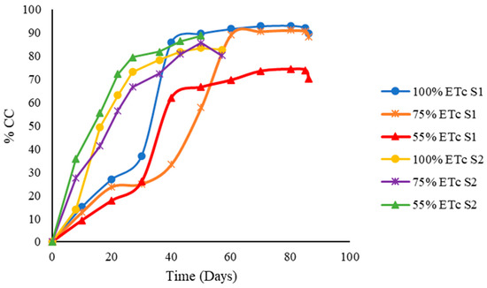 The leaf area index, represented by CCx, was significantly high for the 100% ETc treatment (Figure 3). CCx under 100% ETc was reached after approximately nine weeks after transplanting. Pavlista et al. [17] reached CCx after 10 weeks of planting under optimal irrigation conditions. The 75% ETc treatment recorded a 91% CCx and 85.7% CCx for season 1 (S1) and season 2 (S2), respectively. The 55% ETc treatment recorded a low 74% CCx during S1 and CCx of 86% for S2. The 55% ETc S2 observation contradicted the norm since severe deficit irrigation is reported to yield a reduced canopy cover. The CCx was reached at week eight and week seven after transplanting under 75% ETc and 55% ETc, respectively. Deficit irrigation allows early crop maturity and small canopy cover as a form of drought avoidance mechanism. Small canopy development occurs to minimise water losses through transpiration [31,62].