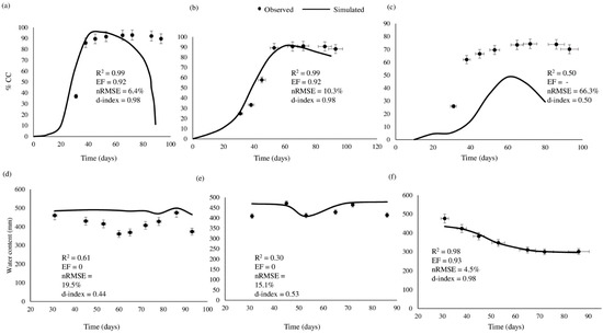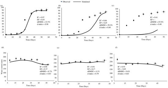 Since AquaCrop is a water-driven model, the model was firstly calibrated for soil water content (SWC). SWC simulations, if done accurately, will improve the accuracy of the simulated biomass and yield [31]. The model satisfactorily simulated the SWC under the 100% ETc irrigation regime (R2 = 0.99, nRMSE = 16.3%, and d = 0.44); thus, the model was successfully calibrated for SWC (Figure 4d). The EF was significantly low, considering that the model successfully simulated CC under the 100% ETc regime. The low EF can potentially be attributed to inherent errors experienced during the calibration for CC. Under 100% ETc, it is evident that the model over-estimated the SWC. This could be potentially attributed to discrepancies in initiating drainage under the continuous irrigation regime. Furthermore, MTI is a slow-release irrigation technology hence the delay in wetting the soil to field capacity. Zeleke et al. [42] attributed the same phenomenon to the lag in AquaCrop to initiate drainage. The model simulated the SWC under the 55% ETc regime well (R2 = 0.98, EF = 0.93, nRMSE = 4.5%, and d = 0.98) (Figure 4f). Despite having simulated the CC under the 75% ETc irrigation regimes well, the model yielded average simulation statistics for SWC (R2 = 0.30, EF = 0, nRMSE = 15.1%, and d = 0.53). Inherent modelling errors in simulating CC can be attributed to the poor R2 value under the 75% ETc irrigation regime (Figure 4e).