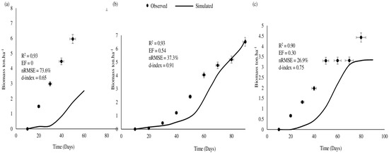 Observed and simulated biomass (B) under (a) 100% ETc, (b) 75% ETc, and (c) 55% ETc irrigation regimes.