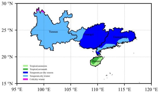 The four southern provinces include Guangdong, Guangxi, Yunnan, and Hainan. In addition, Hong Kong and Macao are also within the study area, but their areas are small and thus are not mentioned in the following sections. Covering most of the Pearl River Basin, the land of the four southern provinces is mostly in the extent of 18–29° N, 92–117° E. It has a total land area of 846,825 km2. As shown in Figure 1, these four southern provinces can be divided into tropical, monsoon climate zone; tropical, savannah climate zone; temperate, no dry season climate zone; temperate, dry winter climate zone; and cold, dry winter climate zone, according to the Köppen climate classification [25]. In this research, we showed the results based on three climate zones: the tropical climate zone (merged by the tropical, monsoon climate zone and the tropical, savannah climate zone); the temperate, no dry season climate zone; and the temperate, dry winter climate zone. The cold, dry winter climate zone in northwestern Yunnan is ignored due to its small area. These four southern provinces are affected by the South Asian and East Asian monsoons, with an average annual precipitation of 1500–2300 mm and a monthly average temperature of 6–25 °C. Although this area has abundant precipitation, the uneven distribution of precipitation has led to frequent droughts and floods. Note that the temperature is almost always above 0 °C, so the growing season is year-round for almost all the places in this study area. This area is populated by about 223 million people and had a gross domestic product of about 2.9 trillion US dollars in 2020.