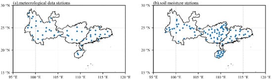 (a) Distribution of meteorological data stations; (b) distribution of soil moisture stations.