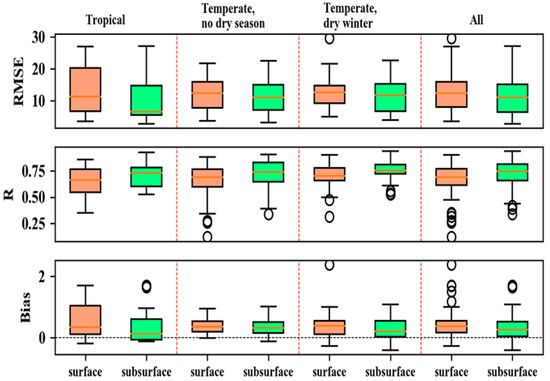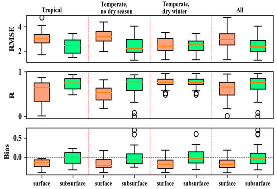 Generally, the ERA5-Land soil moisture coincides well with the in situ data according to the three evaluation indices (Figure 3). The values of RMSE are mostly between 8% and 20%. The values of R are relatively high (mostly between 0.5 and 0.8), all passing the 99% significance test. Moreover, the average R of the surface and subsurface were 0.68 and 0.73 for the three climate zones, respectively, which are close to the results of Beck et al. [12] and Muñoz-Sabate et al. [28]. Beck et al. evaluated 18 satellite- and model-based soil moisture products based on observations mainly from Europe and the U.S.A. and showed that ERA5-Land is one of the best with an average R of 0.72. Muñoz-Sabate et al. evaluate the ERA5-Land soil moisture using data from over 800 in situ sensors from the International Soil Moisture Network and showed an average R around 0.65. In accordance with the RMSE, the subsurface has a higher R value than the surface for all the climate zones because the surface soil moisture is more affected by meteorological conditions. The bias values are positive (i.e., wet bias) in most cases for all climate zones, and the bias in the subsurface is smaller. Among the three climate zones, the tropical climate zone has a lower average RMSE and bias than the other two, especially for the subsurface. However, the tropical climate zone also has a slightly lower R.
